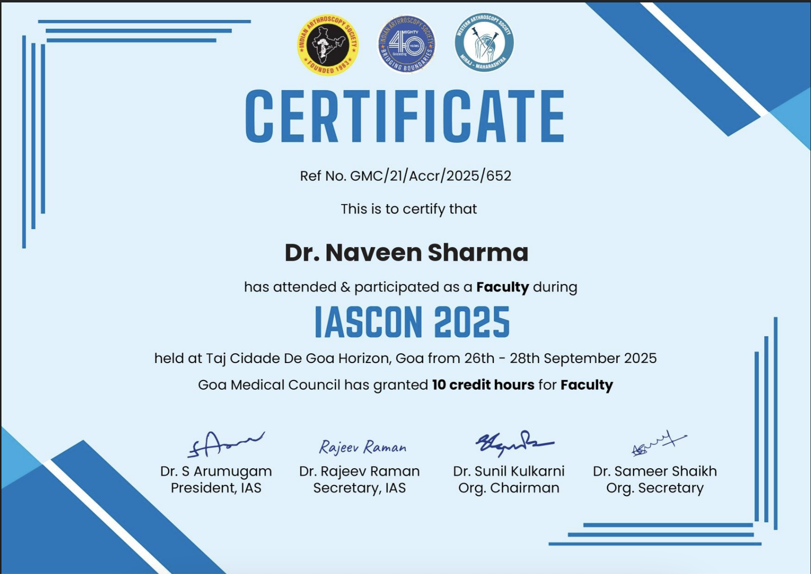 | 5. | JOC, Jaipur | 2012 | Recent advances in shoulder surgeries |