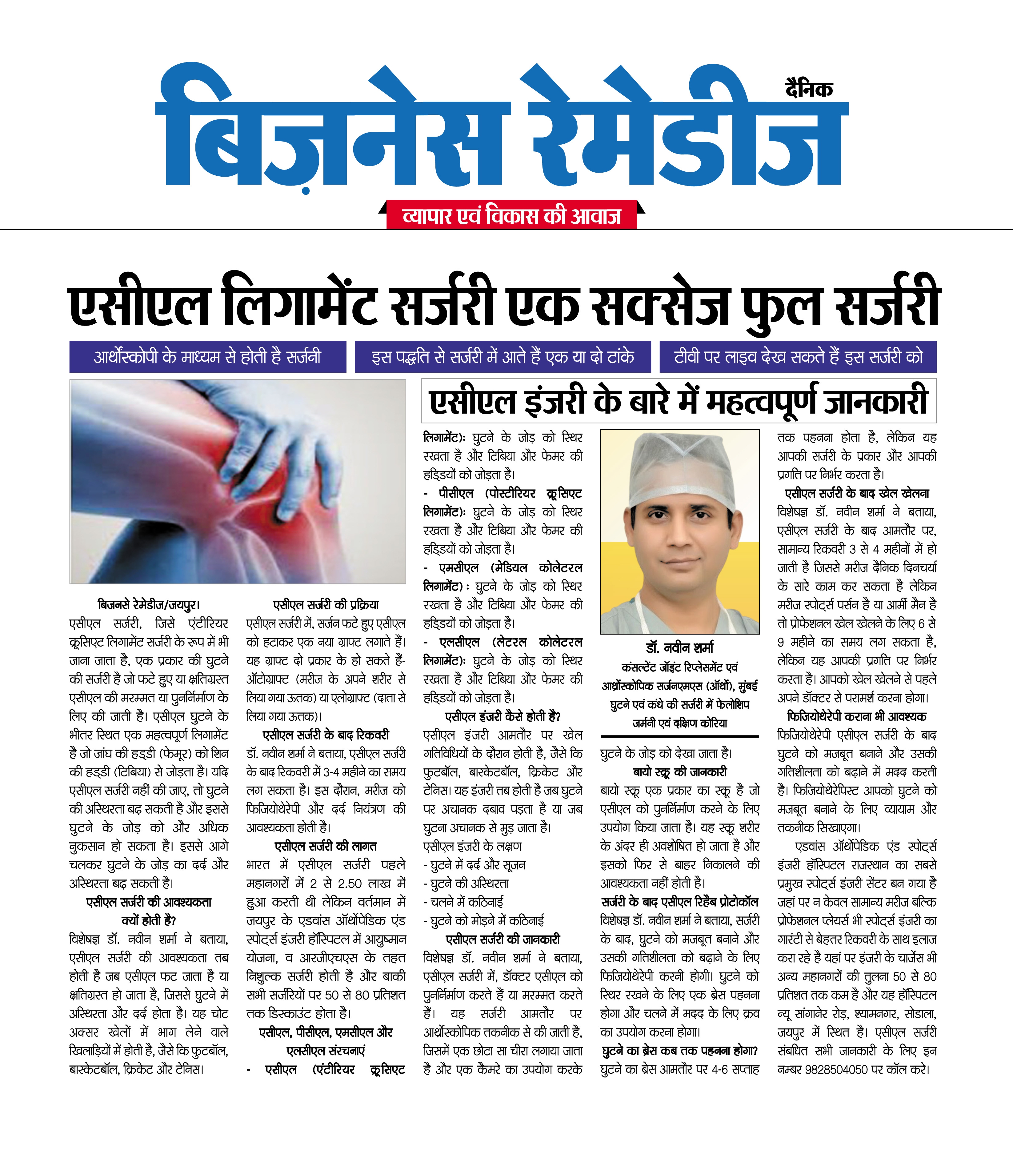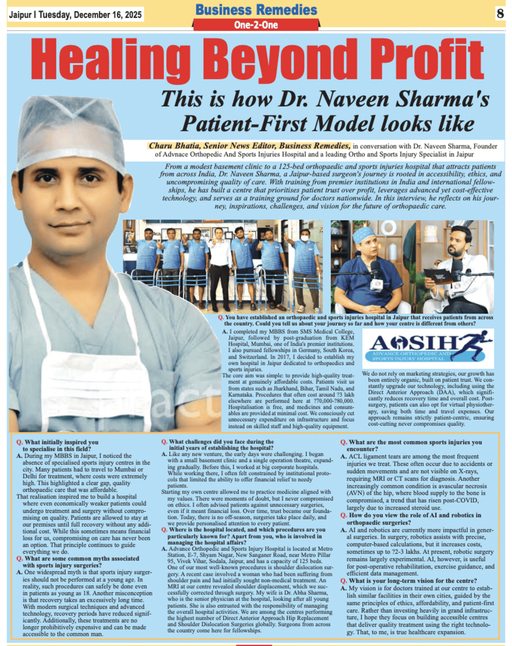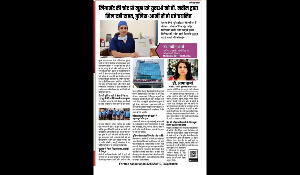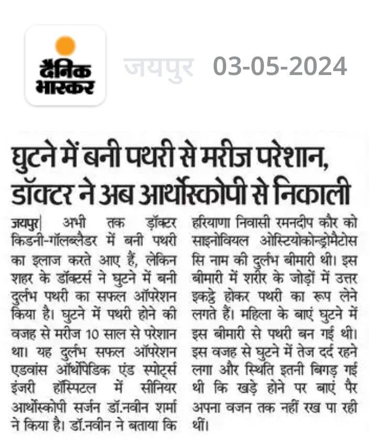 Fellowship-trained care in arthroscopic ACL/PCL & shoulder stabilisation, plus advanced knee and hip replacements with structured rehab and transparent packages. Dr. Naveen Sharma is one of the leading orthopedic surgeons in Jaipur, specializing in joint replacement and arthroscopic surgery. With over 21 years of experience and 11,000+ successful surgeries, he is considered among the best orthopedic doctors in India. Dr. Sharma completed his post-graduation in Orthopaedics from the prestigious KEM Hospital, Mumbai. Following his MS in Orthopaedics, he has worked at several top hospitals across India and abroad, including appointments at Kokilaben Dhirubhai Ambani Hospital and Nair Hospital, Mumbai. To further enhance his expertise, he completed fellowships in advanced knee and shoulder surgery from Germany and South Korea. His global exposure and advanced training make him a trusted name for knee replacement, hip replacement, arthroscopy, and sports injury treatment in Jaipur. Dr. Sharma is an active member of the Indian Orthopedic Association and regularly contributes to medical research published in peer-reviewed journals indexed by PubMed. We believe in empowering patients with knowledge. Learn more about joint health and orthopedic care from these trusted resources: Browse our blog for expert articles on recovery tips, frequently asked questions, and detailed procedure guides. Advance Orthopedic & Sports Injury Hospital (AOSIH) Office Hours: